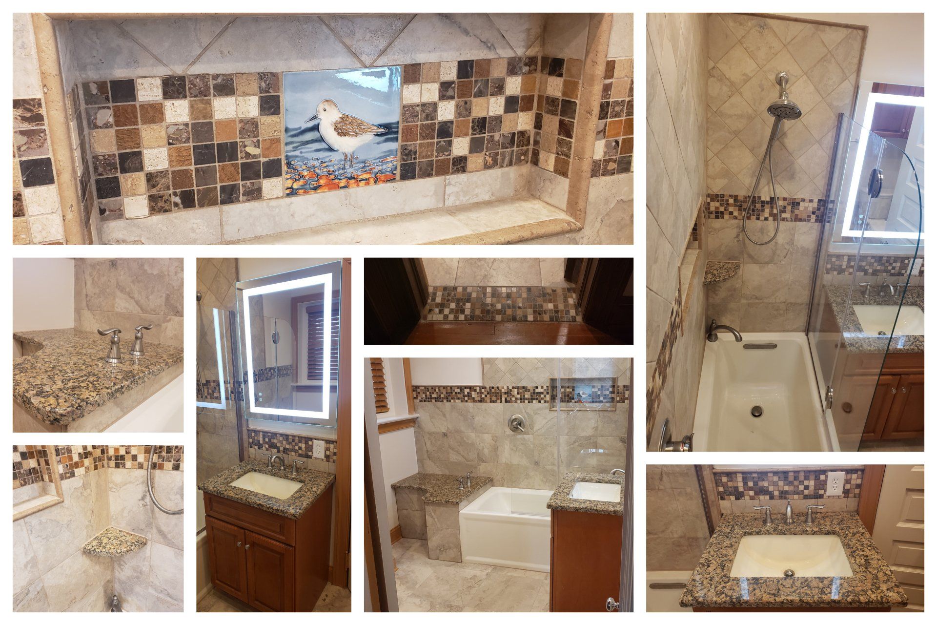 Our Cheltenham client had two needs. First, to remodel the original kitchen into a more functional and enjoyable cooking space with upgraded style. Secondly, to redesign the room for better use of the space and to open up the light and flow of the entire first floor. We partially removed one wall and built a breakfast bar; creating useful countertop space for both the kitchen and living room. This provided sight lines through the entire length of the row home and increased the natural light and openness of the full first floor. Pendant lights over the breakfast bar and sleek black tile topping the half wall define the separate living and kitchen spaces. All new appliances and an abundance of uninterrupted granite countertops makes for delightful prepping, cooking and entertaining for our client in her new kitchen! All of this counter space and plenty of top and bottom cabinets provides more than enough storage space. The glass stainless steel and marble mix backsplash extends from behind the sink through the full side wall to the back window; which looks spectacular and is easy to clean. We helped our client create the best look and maximize the natural light of the space by choosing white cabinets, light brown and tan hues in the counters and backsplash and black granite floor tiles. Our client is happy with her new functional kitchen and how this remodel enhanced the entire first floor of her Cheltenham home.
